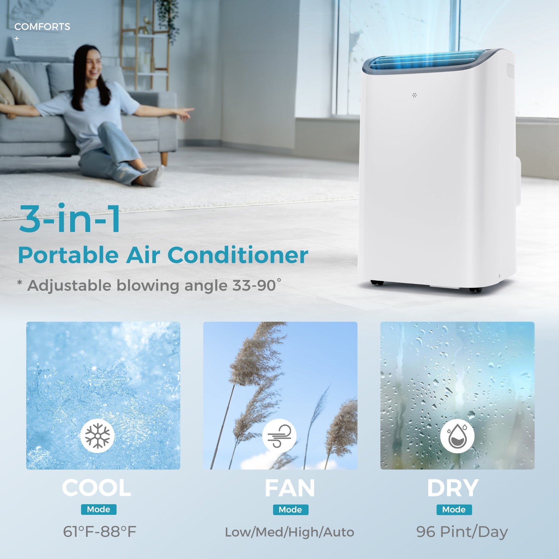 - 3-IN-1 AIR CONDITIONER PORTABLE: The smart air conditioner has cooling, dry, sleep, and fan function modes. In cooling and fan mode, the wind speed can be adjusted to Low, Medium, or High three fan speeds. It is also equipped with an auto swing function, which allows you to adjust settings to your preference and enjoy optimum comfort. When switched to Dry mode, the room AC can remove 96 pints of moisture per day, and it can be automatically drained by simply installing the drain pipe to the drain port, and you can use it as a dehumidifier. Indulge in the customized cooling you deserve with our stand up air conditioner for bedroom