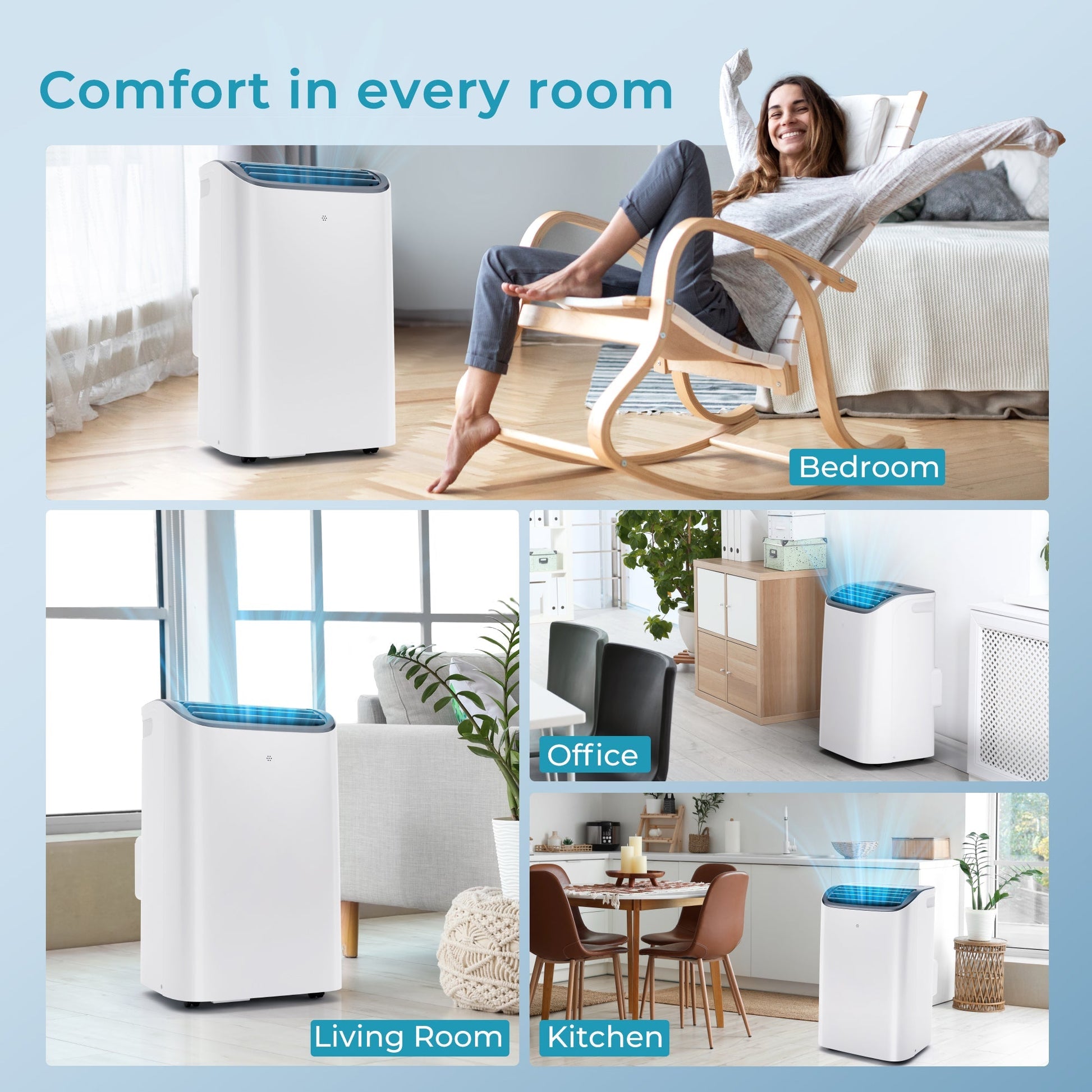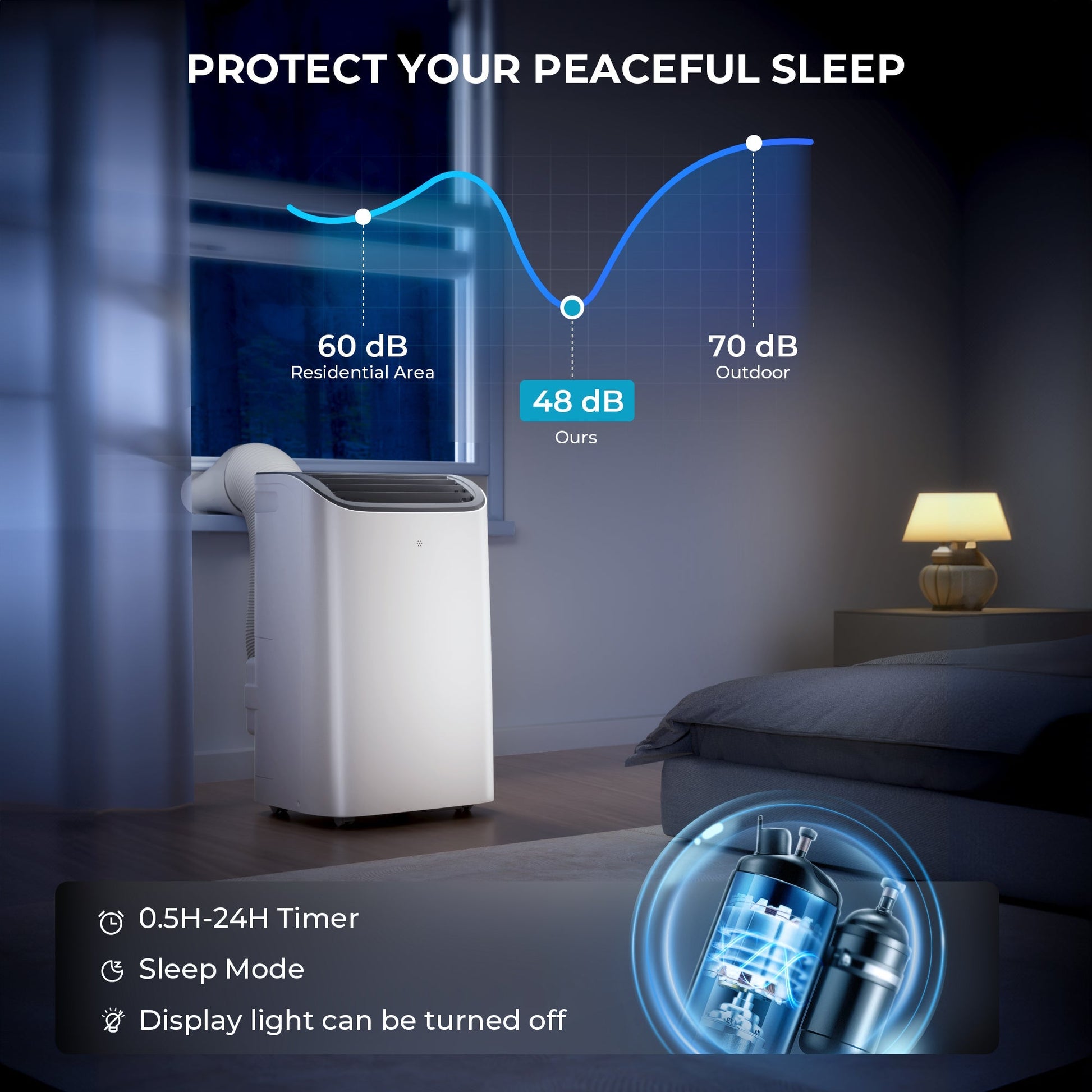 - THE GUARANTEE OF A PEACEFUL SLEEP: In sleep mode, this quiet portable air conditioner automatically reduces the fan speed to 46dB to reduce noise and screen brightness. You can also press the light button to turn off the screen display yourself, helping you have a good sleep. At the same time, this stand up air conditioner for bedroom is equipped with a 24-hour timer, which will automatically shut down when the time you set is reached, saving more energy. You can also turn on the air conditioner's automatic swing function for a more comfortable experience