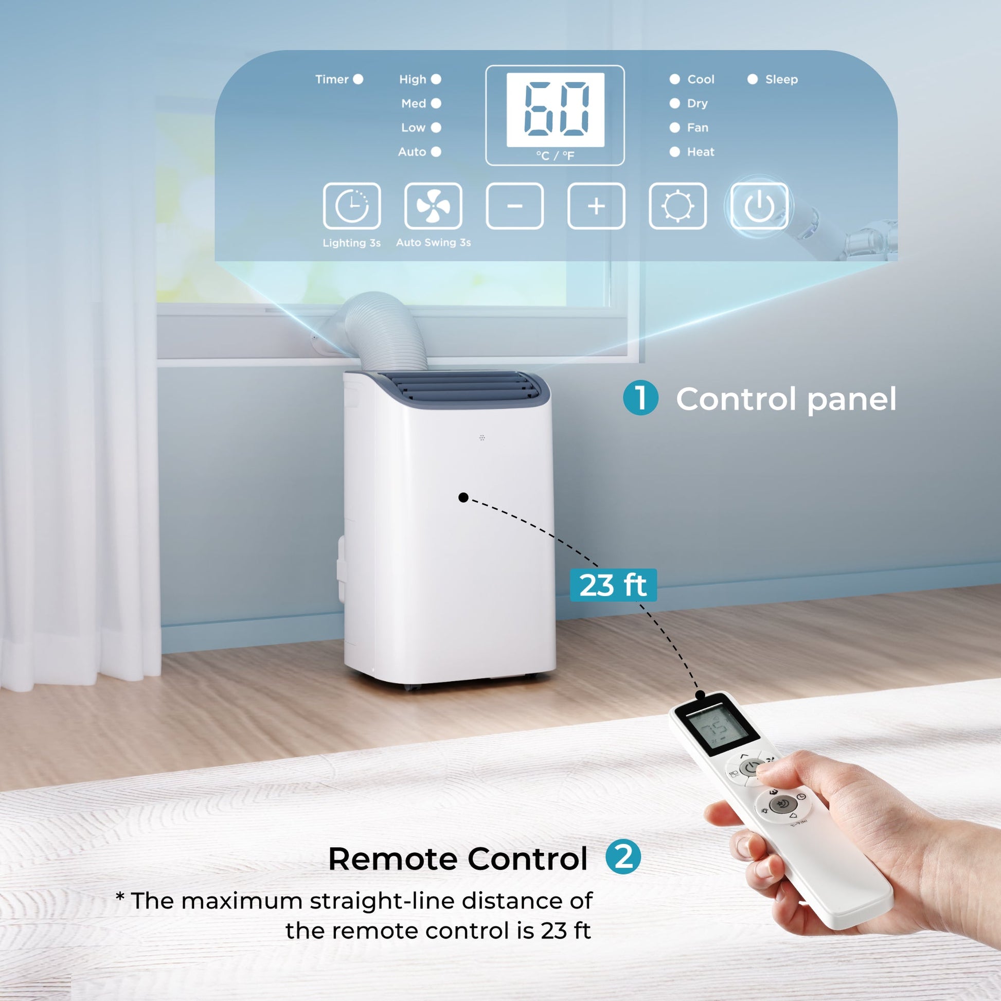 - 2 CONTROL WAYS: The sleek and energy-efficient portable air conditioner 14000 btu features an LED display that provides a clear temperature and icon display. With an impressive 23 ft control distance, this remote offers unparalleled convenience, allowing you to adjust settings from most places in the room or from a distance without bending over. The intuitive design ensures easy operation through simple button touch-friendly controls. This indoor air conditioner is perfect for those seeking a powerful portable ac unit, delivering quiet operation and optimal cooling performance to enhance your comfort and energy savings